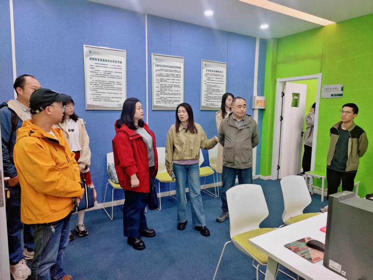 调研活动伊始,在传媒学院院长张西静、副院长沈忠杰等陪同下,谌卉珺院长一行首先参观了传媒学院融媒体实验实践中心,察看了融媒体演播厅、数字采编实验室、新媒体运营实训区等功能模块,详细了解了中心的设备配置、课程对接模式及学生实践项目开展情况。谌卉珺院长一行对中心“教学-实践-产出”一体化的建设理念表示认可,认为其为传媒类专业学生搭建了高效的实践平台,对提升学生专业技能具有重要支撑作用。